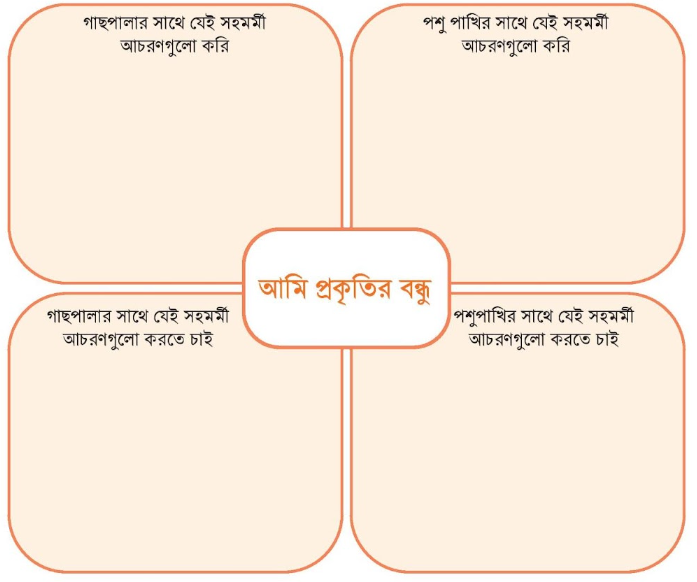 এবার দেখে নিই আমরা কী কী করি গাছপালা, পশু-পাখির জন্য। এদের জন্য আমরা যে আচরণগুলো করি এবং যেগুলো করতে চাই সেগুলো অপর পৃষ্ঠার বক্সে লিখি। তাহলে আমরা দেখতে পাব কোন কোন সহমর্মী আচরণের জন্য আমরা নিজেদেরকে তাদের বন্ধু দাবি করতে পারি।