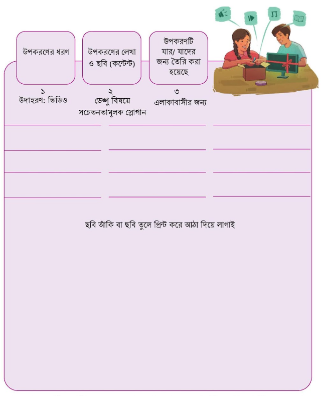 এবার সমস্যা সমাধানের জন্য যে লেখা/ছবি ও উপকরণ ব্যবহার করেছিলাম, তা ভালো করে দেখার পালা। পরের পৃষ্ঠার ঘরটি ব্যবহার করে আমরা দলে সচেতনতার জন্য যে উপকরণটি ও উপকরণের ভেতরের লেখা ও ছবি বানিয়েছিলাম, তা দলের সদস্যরা মিলে আলোচনার মাধ্যমে বিশ্লেষণ করতে পারি।