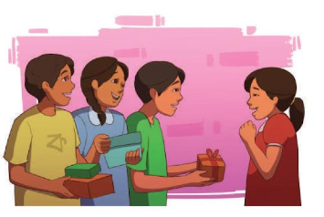 দুজন উপস্থাপন করি। অন্যান্য দলগুলো ও কিন্তু উপস্থাপন করবে। একটি বিষয় আমরা কি খেয়াল করেছি? দলগুলো যে বিষয়ের ওপর উপহার বানাতে চায়, তার নির্ধারিত ব্যক্তি বা লক্ষ্য দল ভিন্ন এবং ওই ব্যক্তি বা লক্ষ্য দল অনুযায়ী উপহারের ধরনও ভিন্ন।