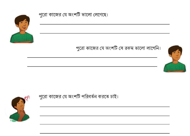 এবার এই সেশনের কাজটি আমাদের কাছে কেমন লেগেছে, আমাদের অভিজ্ঞতা ও আমরা কী শিখলাম তা নিচে লিখতে পারি।