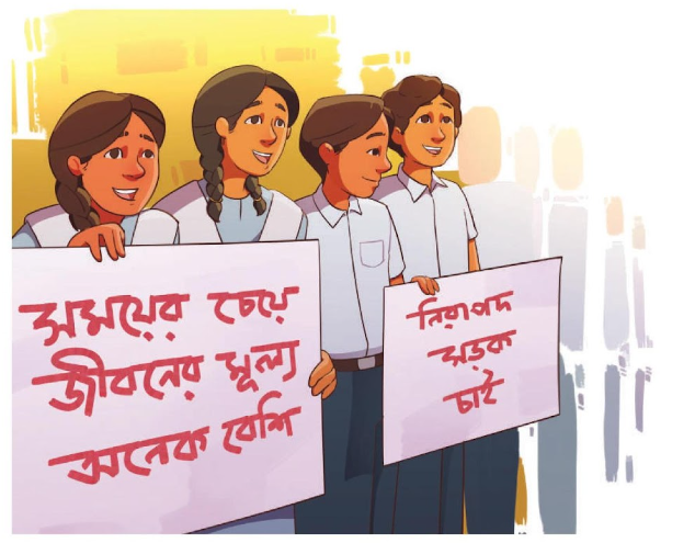 ৪. শিক্ষার্থীরা বিদ্যালয়ের মূল গেটের সামনে দাঁড়িয়ে প্ল্যাকার্ড প্রদর্শন করছে। গ্রামের কয়েকজন ওই রাস্তা দিয়ে যাওয়ার সময় শিক্ষার্থীদের দিকে তাকিয়ে থাকবে। প্রদর্শনীতে ছেলে ও মেয়ে শিক্ষার্থী সমান সংখ্যক থাকবে। প্ল্যাকার্ডে লেখাগুলো অস্পষ্ট থাকবে।