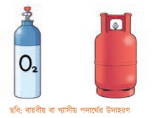 আমাদের চারপাশে বাতাস সেই বাতাসে আমরা নিঃশ্বাস প্রশ্বাস নেই। অনেক গাড়ি প্রাকৃতিক গ্যাস বা সিএনজিতে চালানো হয়। কেতলিতে পানি ফুটানো হলে সেখান থেকে বাষ্প বের হয়। এইসবই হচ্ছে বায়বীয় বা গ্যাসীয় পদার্থের উদাহরণ। কঠিন এবং তরল দুই ধরনের পদার্থেরই আয়তন নির্দিষ্ট থকে কিন্তু গ্যাসের জন্য সেটা সত্যি নয়।পদার্থ ও তার বৈশিষ্ট্য।