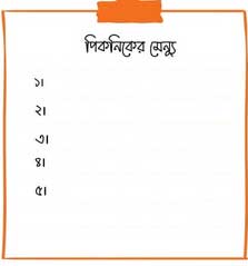ক্লাসের সবাই নিশ্চয়ই নিজের পছন্দের খাবার লিখে ফেলেছে! দেখো তো, এর মধ্যে কোনগুলো তোমাদের পিকনিকের মেন্যুতে থাকতে পারে? চাইলে এর বাইরেও কোনো খাবারের কথাও ভাবতে পারো।