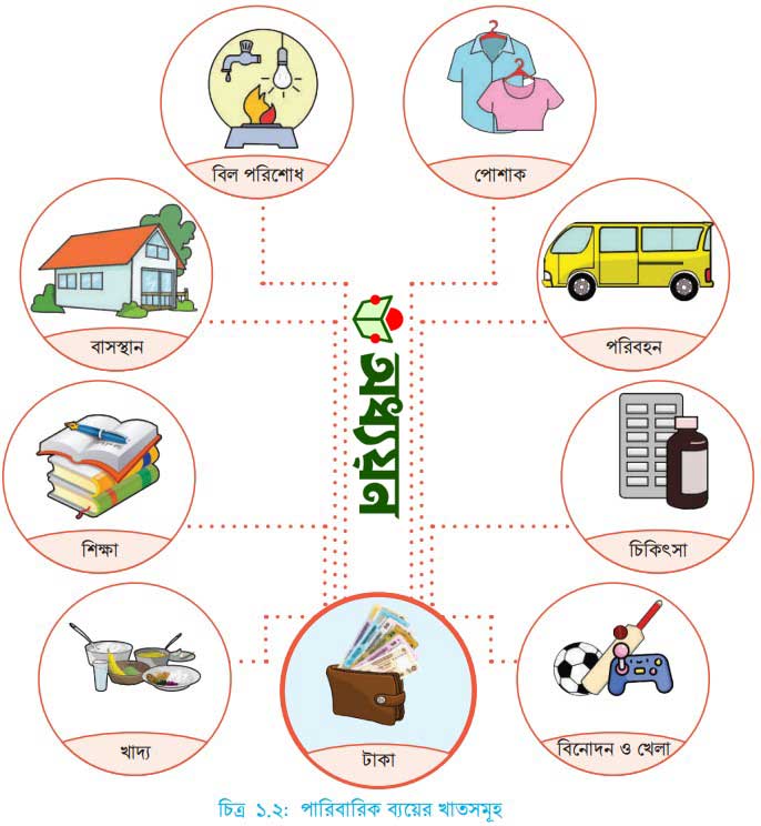 নিচের ছবিটি দেখলে তোমরা পারিবারিক ব্যয়ের খাত গুলো সম্পর্কে সম্পূর্ণ ধারণা পেয়ে যাবে।