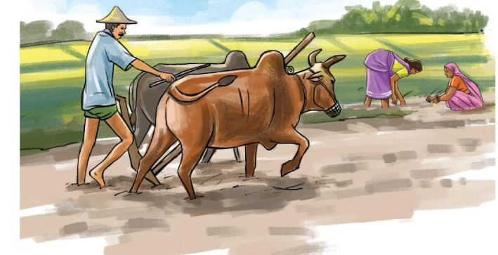 - সেই তালিকা থেকে ছবির বিষয়বস্তু বেছে নিতে হবে। যেমন-কৃষাণ-কৃষাণির অবয়ব/কৃষি কাজে ব্যবহৃত নানা উপকরণ যেমন- কাস্তে/মাথাল(মাথার টুপি),লাঙ্গল/কাকতাড়ুয়া/ডালা/কুলা ইতাদি।