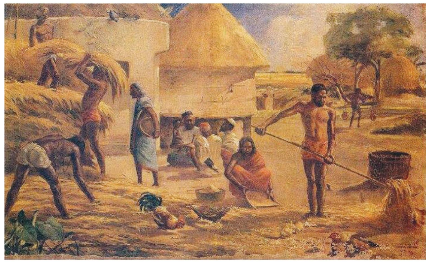 হেমন্তে পাকা ধান কেটে মাথায় করে নিয়ে আসা,ধান মাড়াই করে রোদরে শুকানো।বাংলার এই চিরন্তন রুপ শিল্পীর তুলিতে উঠে এসেছে বার বার।