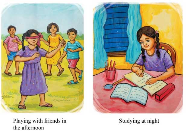 The following illustrations are on the daily activities of Aria, a student of class six. In groups/pairs first, discuss and then sequence all the activities of Aria beginning from early morning to night. Then, describe them in writing using appropriate articles and pronouns. Finally, present it to the whole class.